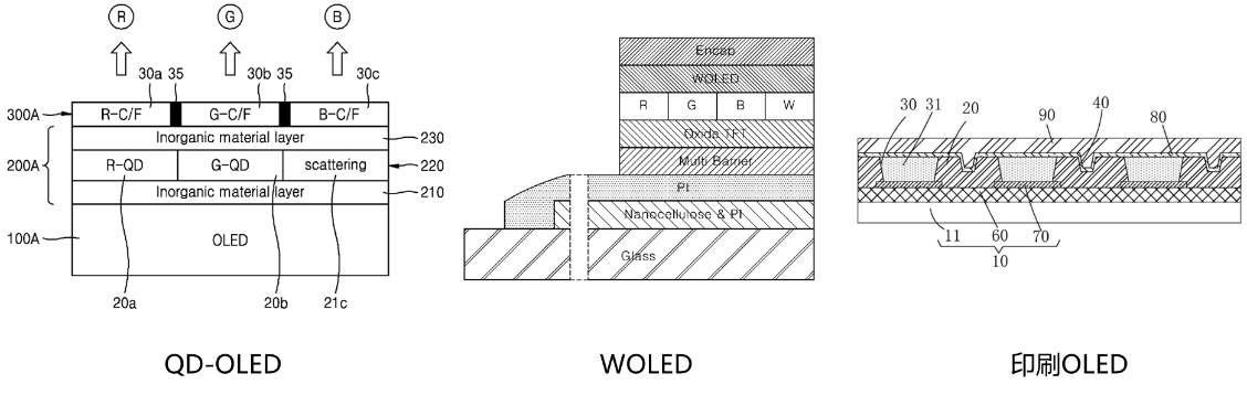 For instance, in Figure 1, Samsung has developed QD-OLED technology based on the evaporation process, where only the blue light layer requires the evaporation process, simplifying production and improving luminous performance. Currently, this technology is primarily used in large-size products, with small-size QD technology still under development. LG Display focuses on large-size OLEDs, utilizing white OLED (WOLED) technology with a color filter to avoid mask alignment issues. Additionally, in 2019, LG Display achieved the industry's first stacked OLED commercialization, which significantly improved both the lifespan and brightness of OLED displays.